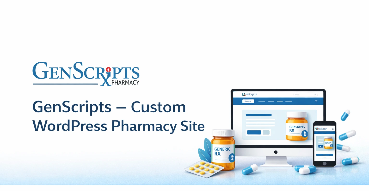 GenScripts, an independent pharmacy chain in Tulsa-area locations (Broken Arrow, Owasso, Bixby), partnered with us for a full WordPress redesign and development. Our work created a user-friendly site emphasizing low-cost meds, free delivery, and cost-saving consults—enhancing patient trust and driving service inquiries.