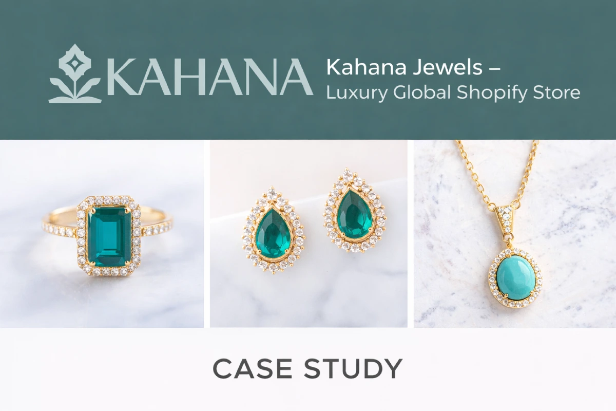 Kahana Jewels, creators of Indian-inspired contemporary fine jewelry ("Kahana" meaning "story" from Hindi "kahani"), returned to us after our Wedding Brigade project for a premium Shopify build. Our end-to-end development powers worldwide sales of pieces like Din-Raat Ear Cuffs ($2,550 USD) and Navratna Hoops ($3,500 USD), blending…